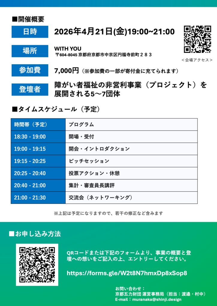 ■ お問い合わせ 京都五力財団運営事務局(担当:渡邉・村中) E-mail: muranaka@shinji.design