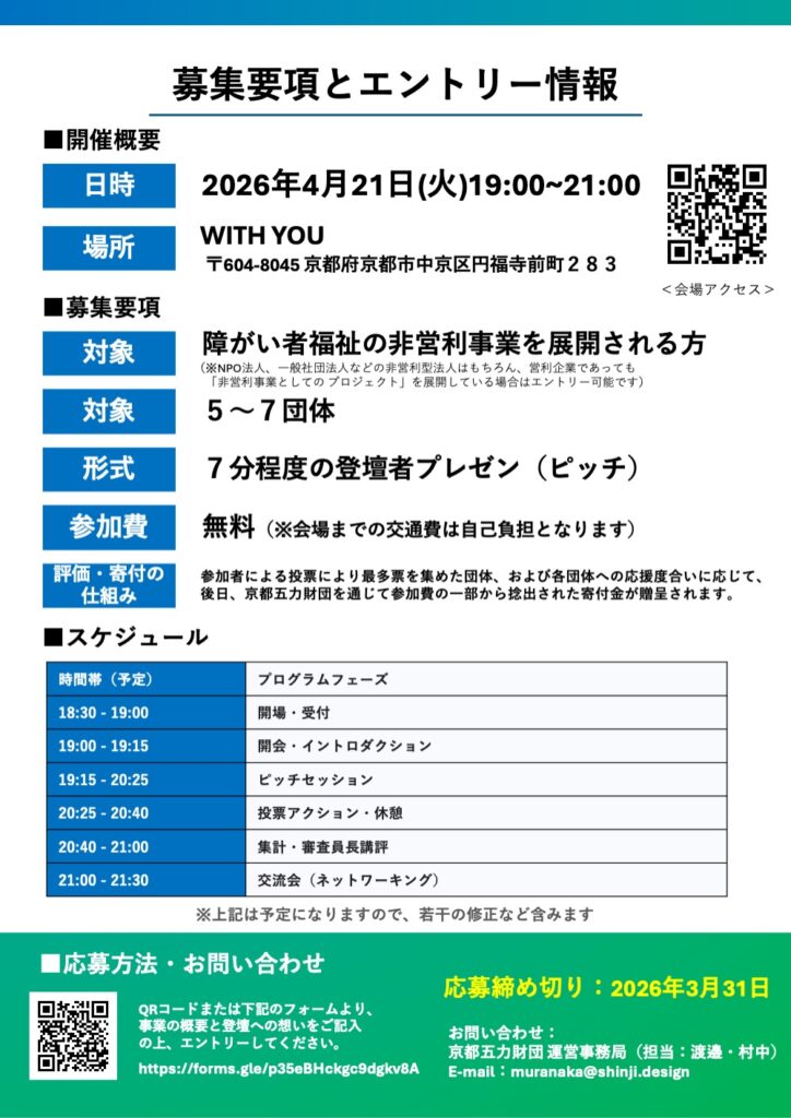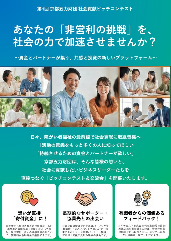 京都五力財団では、障がい者福祉の最前線で活動されている皆様の「非営利の挑戦」を、社会の力で加速させるための新しいプラットフォームとして、ピッチコンテストを開催いたします 。
