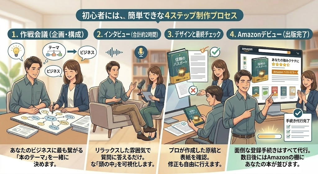 専門のインタビュアーがあなたの強みを引き出し、プロのライターが読みやすい文章にまとめ、プロのデザイナーがAmazonで目を引く「売れる表紙」を作成します。