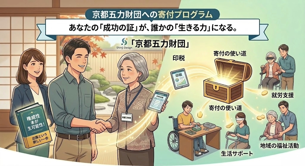 - 寄付の仕組み: あなたが著者として本を出版した際、そこから生まれる印税(売上の全額、または一部)を、京都五力財団に寄付することが可能です。